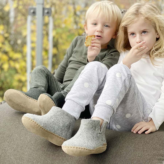 Our junior boots are made of 100% pure, natural wool in the colour grey with a sole of soft and chrome-free calfskin.