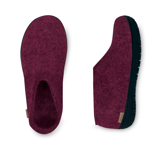 Felt shoe of 100% pure natural wool in the classic color cranberry with a sole of black rubber.
